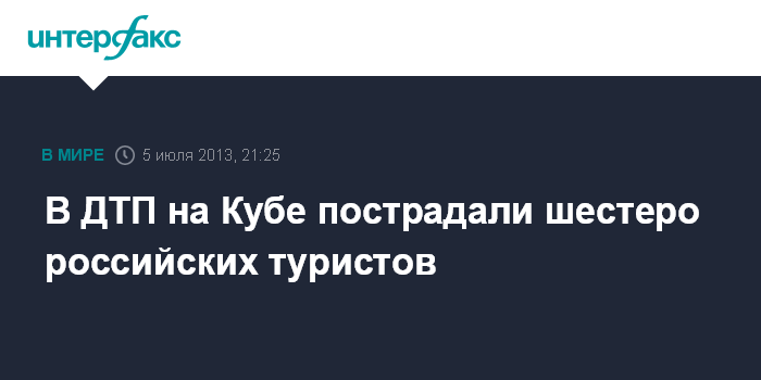 Москва/Гавана. 5 июля. INTERFAX.RU - Шестеро российских туристов пострадали в ДТП, произошедшем на Кубе в 6 часов по московскому времени в пятницу, сообщили кубинские СМИ.