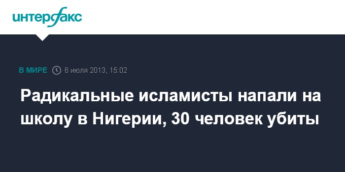 Йоханнесбург. 6 июля. INTERFAX.RU - По меньшей мере 29 учеников и учитель были убиты в результате нападения боевиков-исламистов на среднюю школу-интернат на северо-востоке Нигерии, передает в субботу агентство AP.