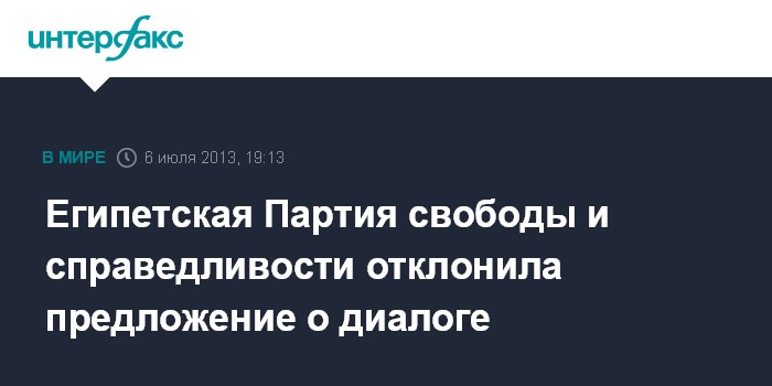 Каир. 6 июля. INTERFAX.RU - Представители египетской Партии свободы и справедливости не приняли предложение о проведении переговоров со стороны временно исполняющего обязанности президента Адли Мансура, отмечается в коммюнике фракции, опубликованном в субботу. "Мы не будем участвовать в национальном диалоге, к которому призвал незаконно пришедший к власти глава государства А.Мансур", - заявил генсек партии Хусейн Ибрагим.