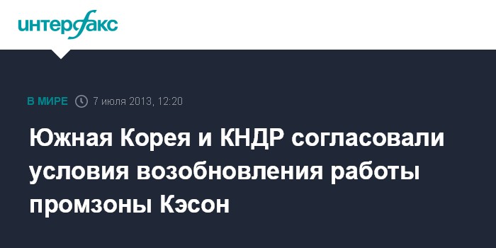 Сеул. 7 июля. INTERFAX.RU - Делегации из Южной Кореи и КНДР согласовали условия для нормализации работы совместной промзоны Кэсон, сообщили журналистам в южнокорейском министерстве по делам объединения.
