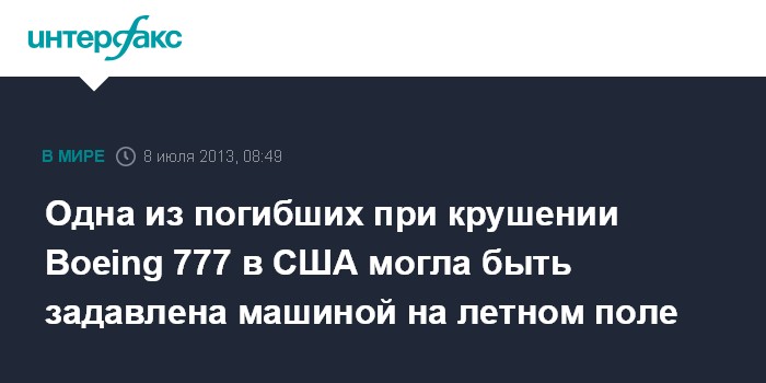 Вашингтон. 8 июля. INTERFAX.RU - Одна из жертв аварии южнокорейского самолета в Сан-Франциско могла быть задавлена автомашиной после приземления лайнера, сообщили власти аэропорта.