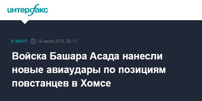 Лондон. 10 июля. INTERFAX.RU - Правительственные войска произвели новые авиаудары по позициям повстанцев в городе Хомс на западе Сирии, сообщает BBC. Сирийская армия при поддержке шиитской организации "Хезболла" начала новое наступление на силы оппозиции в Хомсе неделю назад.