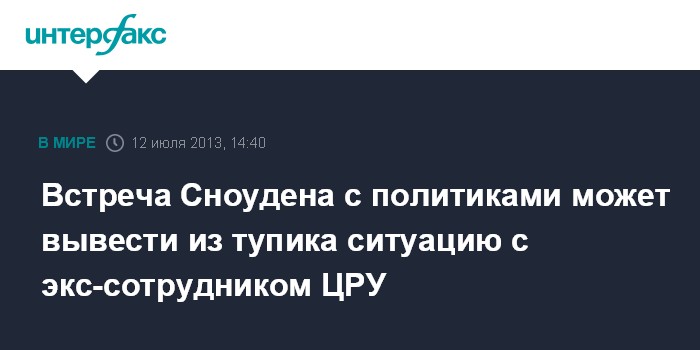 Москва. 12 июля. INTERFAX.RU - Встреча экс-сотрудника ЦРУ Эдварда Сноудена с группой российских политиков, правозащитников, адвокатов призвана вывести из тупика положение, сложившееся вокруг беглого американца, считает источник "Интерфакса", знакомый с ситуацией.