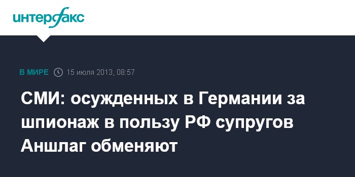 Москва. 15 июля. INTERFAX.RU - Супругов Андреаса и Хайдрун Аншлаг, осужденных в Германии за шпионаж в пользу РФ, планируется обменять на кого-либо из отбывающих наказание в России западных агентов, пишет в понедельник "Коммерсант".
