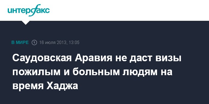 Дубай. 16 июля. INTERFAX.RU - Лицам, страдающим хроническими заболеваниями, в этом году не будут выдавать визы в Саудовскую Аравию на время Хаджа для предупреждения распространения ближневосточного респираторного синдрома коронавируса (MERS-CoV), сообщает Arab news со ссылкой на министра здравоохранения страны.