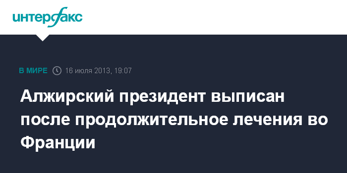 Алжир. 16 июля. INTERFAX.RU - Президент Алжира Абдельазиз Бутефлика вернулся во вторник на родину после продолжительного курса лечения во французской больнице, сообщают местные власти.