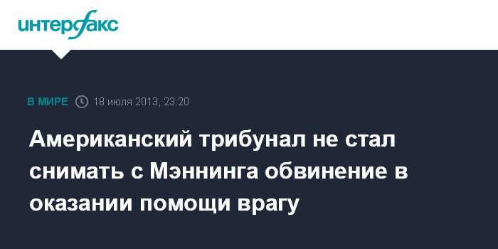 Вашингтон. 19 июля. INTERFAX.RU - Военный трибунал США отказался снять с предполагаемого информатора Wikileaks Брэдли Мэннинга обвинение в оказании помощи врагу, сообщает в четверг газета Washington Post.