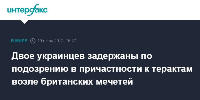 Киев. 19 июля. INTERFAX.RU - Правоохранительные органы Великобритании задержали по подозрению в совершении или причастности к совершению взрывов возле мечетей в Великобритании двух украинцев.