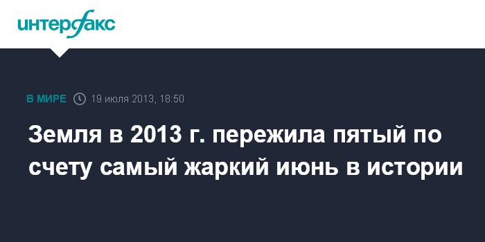 Вашингтон. 19 июля. INTERFAX.RU - Планета Земля пережила пятый самый жаркий июнь за всю историю ведения статистики, сообщили в пятницу в Национальном управлении океанических и атмосферных исследований США.