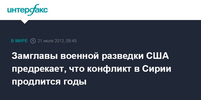 Вашингтон. 21 июля. INTERFAX.RU - Заместитель руководителя военной разведки США Дэвид Шедд считает, что внутрисирийский конфликт продлится месяцы, а, возможно, и годы.