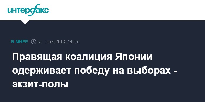 Токио. 21 июля. INTERFAX.RU - Правящая коалиция Японии, в которую входят Либерально-демократическая партия и партия Новая Комэйто, одерживает убедительную победу на выборах в верхнюю палату парламента страны, свидетельствуют результаты экзит-полов.