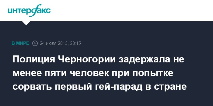 Белград. 24 июля. INTERFAX.RU - По меньшей мере, пять человек было задержано в ходе столкновений между стражами порядка и противниками гей-парада в прибрежном городе Будва в Черногории, сообщают в среду черногорские СМИ.