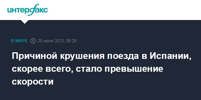 Мадрид. 25 июля. INTERFAX.RU - Наиболее вероятной причиной катастрофы пассажирского поезда в Испании эксперты называют значительное превышение скорости движения.