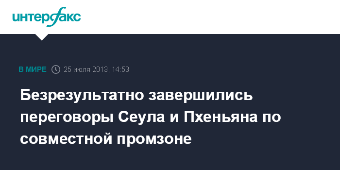 Токио. 25 июля. INTERFAX.RU - Делегации Южной Кореи и КНДР не смогли добиться прорыва в ходе шестого раунда переговоров по вопросу о возобновлении работы совместной промзоны Кэсон, сообщают в четверг японские СМИ.