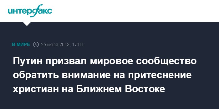 Москва. 25 июля. INTERFAX.RU - Президент РФ Владимир Путин выразил обеспокоенность притеснением прав религиозных меньшинств, в частности, православных христиан в ходе конфликтов, имеющих место в странах Ближнего Востока и Северной Африки.
