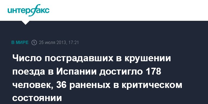 Мадрид. 25 июля. INTERFAX.RU - Количество пострадавших пассажиров в результате катастрофы поезда близ города Сантьяго-де-Компостела возросло до 178 человек, сообщила в четверг журналистам советник по безопасности автономного сообщества Галисия Росио Москера.