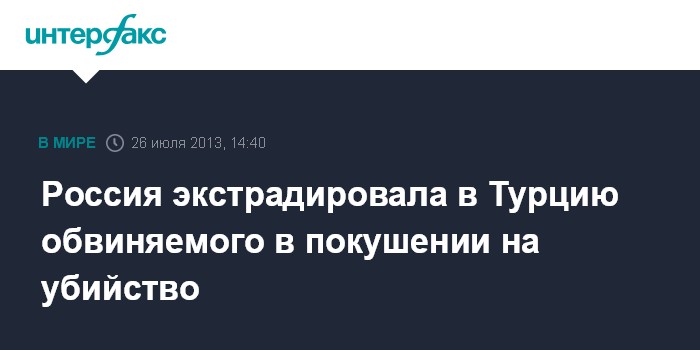 Москва. 26 июля. INTERFAX.RU - Российские правоохранительные органы экстрадировали в Турцию гражданина этой страны, который был задержан в Новороссийске по обвинению в совершении на родине покушения на убийство.