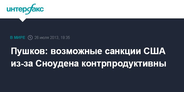 Москва. 26 июля. INTERFAX.RU - Глава думского комитета по международным делам Алексей Пушков считает, что возможное принятие США поправки о введении санкций против России и других стран, которые окажут поддержку бывшему сотруднику ЦРУ Эдварду Сноудену, контрпродуктивно и чревато ответными мерами, но при этом не видит серьезных перспектив принятия такого решения.