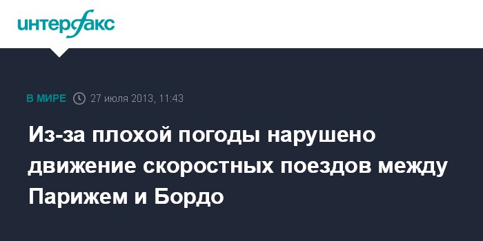 Париж. 27 июля. INTERFAX.RU - Отправление нескольких скоростных пассажирских поездов задержано в субботу на трассе между Парижем и Бордо из-за сильных бурь, сообщает железнодорожная компания Франции.