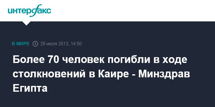Каир. 28 июля. INTERFAX.RU - В результате столкновений египетской полиции с оппозиционерами в Каире погибли 72 человека, сообщили в воскресенье в министерстве здравоохранения Египта. По словам представителя ведомства Халеда аль-Хатыба, еще восемь человек погибли в подобных стычках в Александрии. В общей сложности, 792 человека получили ранения и травмы в результате столкновений в этих двух городах.
