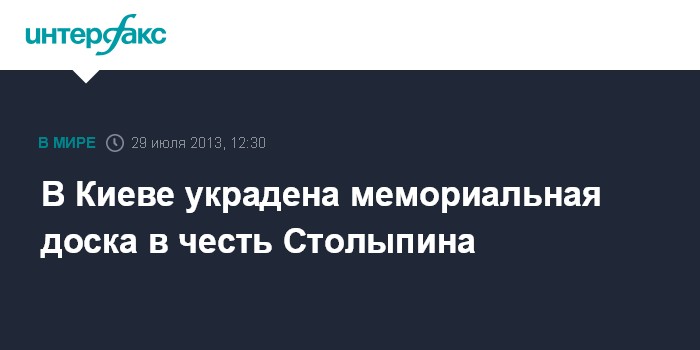 Киев. 29 июля. INTERFAX.RU - Мемориальная табличка министру внутренних дел, премьер-министру Российской империи (1906-1911) Петру Столыпину, исчезнувшая со здания на улице Гончара в Киеве, была украдена, сообщил агентству "Интерфакс-Украина" источник в Киевской государственной администрации.