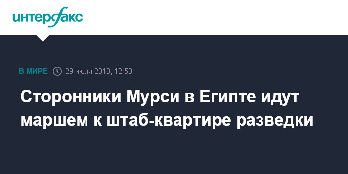 Дубай. 29 июля. INTERFAX.RU - Сторонники свергнутого президента Египта Мухаммеда Мурси в понедельник устроили шествие в сторону штаб-квартиры военной разведки в Каире, передает межарабский телеканал Al Arabiya.