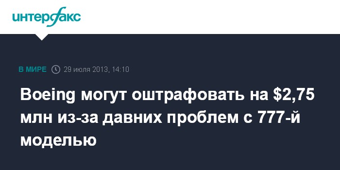 Вашингтон. 29 июля. INTERFAX.RU - Федеральное управление авиации США (FAA) предложило взыскать с Boeing гражданский штраф в размере $2,75 млн в связи с тем, что концерн не исправлял проблему с креплениями на самолетах Boeing 777 более двух лет после ее обнаружения в 2008 году, пишет MarketWatch.