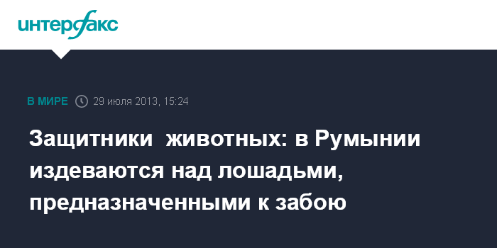 Брюссель. 29 июля. INTERFAX.RU - В Румынии, которая является крупнейшим в Евросоюзе поставщиком конины, лошади, предназначенные на мясо, подвергаются жестокому обращению, свидетельствует в понедельник в Брюсселе известная бельгийская ассоциация по защите животных Gaia.