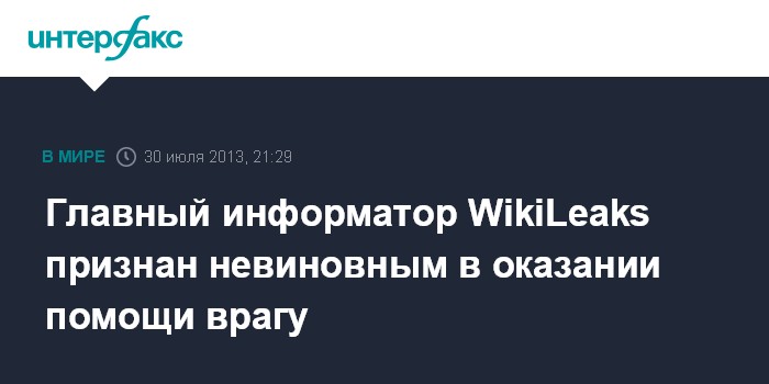 Вашингтон. 30 июля. INTERFAX.RU - Военный трибунал США признал информатора сайта Wikileaks Брэдли Мэннинга невиновным в оказании помощи врагу, сообщает во вторник АП.