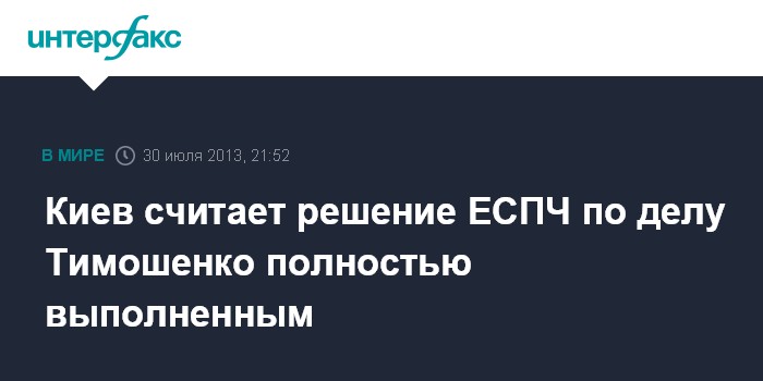 Киев. 30 июля. INTERFAX.RU - Решение Европейского суда по правам человека (ЕСПЧ) в деле "Тимошенко против Украины" полностью выполнено и не влечет за собой дополнительных обязательств Украины, сообщается на сайте Министерства юстиции Украины.