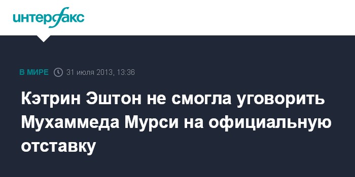 "Президент Мурси отверг попытки Эштон заставить его добровольно сложить полномочия и принять предложения, равносильные признанию военного переворота", - сказал представитель исламистского движения турецкому Анатолийскому информационному агентству.