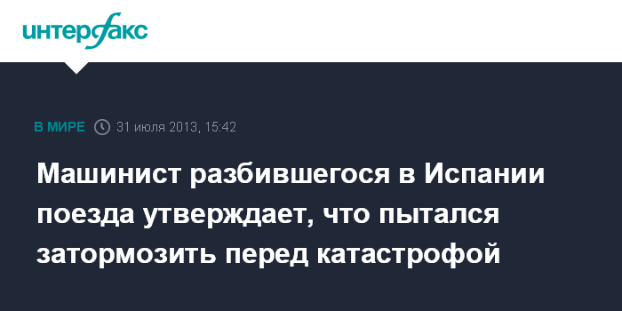 Мадрид. 31 июля. INTERFAX.RU - Машинист потерпевшего крушение испанского поезда Франсиско Хосе Гарсон на слушаниях в суде сообщил, что пытался включить тормозную систему перед фатальным поворотом. "Я не настолько безумен, чтобы не тормозить, я включил все тормоза, но на повороте понял, что не пройду его", - сказал он.