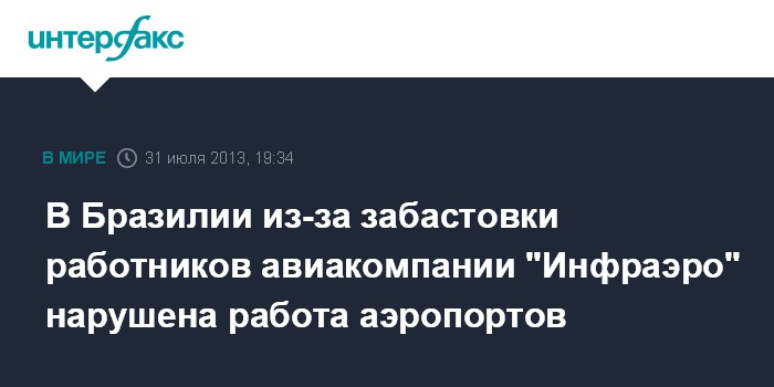 Бразилиа. 31 июля. INTERFAX.RU - Аэропорты Бразилии работают с перебоями из-за 24-часовой забастовки, которую устроили работники государственной компании "Инфраэро", сообщает агентство ЭФЭ.