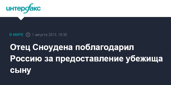 Москва. 1 августа. INTERFAX.RU - Отец бывшего сотрудника спецслужб США Эдварда Сноудена благодарит российские власти за решение о предоставлении убежища его сыну.