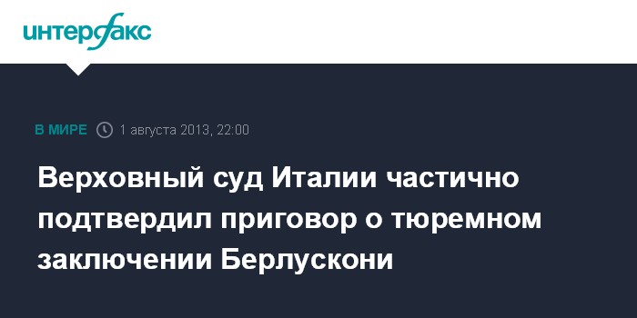 Рим. 1 августа. INTERFAX.RU - Верховный кассационный суд Италии частично подтвердил вынесенный ранее судами первой и второй инстанции в отношении Сильвио Берлускони обвинительный приговор по так называемому "делу Mediaset", передает в четверг итальянское телевидение.