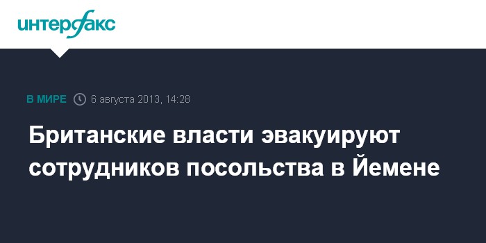 Лондон. 6 августа. INTERFAX.RU - Власти Великобритании из соображений безопасности решили вывезти всех сотрудников своей дипмиссии в Йемене, говорится в распространенном во вторник заявлении "Форин офиса".