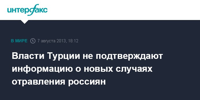 Москва. 7 августа. INTERFAX.RU - Информация о новых случаях отравления российских туристов в отелях Турции не подтверждается, сообщил "Интерфаксу" руководитель отдела культуры и туризма посольства Турции в РФ Джелаль Кылыч.