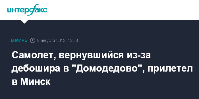 Минск. 8 августа. INTERFAX.RU - Самолет "Белавиа, который в четверг утром был вынужден после отправки из Москвы вернуться в "Домодедово" из-за пьяного дебошира на борту, благополучно прилетел в Национальный аэропорт Минск.