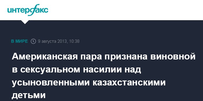 Астана. 9 августа. INTERFAX.RU - Присяжные заседатели Верховного суда города Вустер (США) признали виновными жителей городка Уитинсвилль 50-летнего Джозефа Мэйотта и его 49-летнюю супругу Линду в сексуальном насилии над усыновленными детьми из Казахстана, сообщило издание The Telegram & Gazette в пятницу.