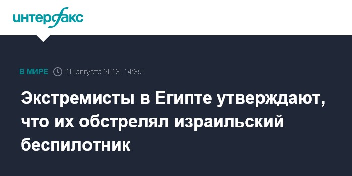 Каир. 10 августа. INTERFAX.RU - Израильский беспилотный самолет нанес удар по экстремистам на территории Египта, заявили в субботу боевики группировки "Анса Бейт аль-Макдис". По их информации, в ходе совершенного в пятницу авиаудара на Синайском полуострове погибли четверо боевиков, готовившихся совершить ракетный обстрел израильской территории.