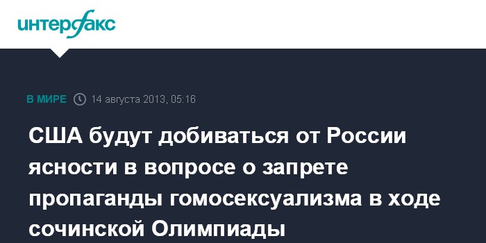 Вашингтон. 14 августа. ИНТЕРФАКС - Соединенные Штаты будут продолжать контакты с Россией, и добиваться полной ясности в том, будет ли закон о запрете пропаганды гомосексуализма среди несовершеннолетних применяться в ходе Олимпиады в Сочи, заявила представитель госдепартамента США Мари Харф.