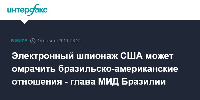 Бразилиа. 14 августа. ИНТЕРФАКС - Контроль спецслужб США над электронной перепиской и телефонными переговорами бразильских учреждений и граждан страны может осложнить развитие отношений между двумя странами, заявил министр иностранных дел Бразилии Антониу Патриота.