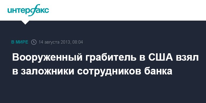 Вашингтон. 14 августа. INTERFAX.RU - Вооруженный грабитель в американском городе Сент-Джозеф штата Луизиана взял в заложники трех сотрудников местного банка, сообщило агентство АР. По данным на утро среды, грабитель освободил одну из заложниц, но продолжает удерживать двух человек.