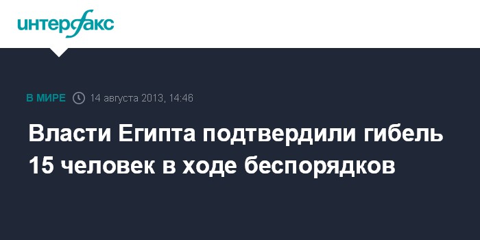 Каир. 14 августа. INTERFAX.RU - Жертвами столкновений в Каире стали 15 человек, еще 203 получили ранения, сообщили в среду в министерстве здравоохранения Египта.