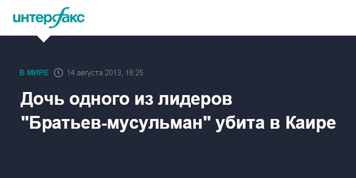 Каир. 14 августа. INTERFAX.RU - При разгоне в среду в Каире лагеря сторонников низложенного президента-исламиста Мухаммеда Мурси убита дочь одного из лидеров движения "Братьев-мусульман" Мухаммеда аль-Бельтаги, сообщили египетские СМИ.