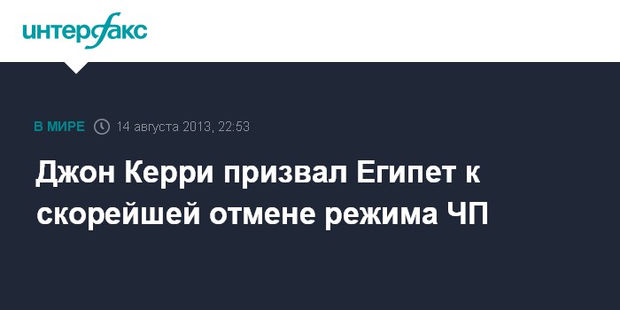 Вашингтон. 14 августа. INTERFAX.RU - Госсекретарь США Джон Керри в среду решительно осудил насилие в Египте и призвал египетские власти как можно скорее отменить режим чрезвычайного положения.