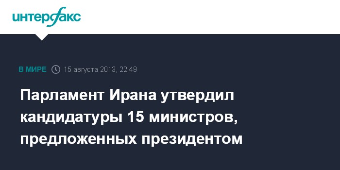 Тегеран. 15 августа. INTERFAX.RU - Парламент Ирана в четверг одобрил 15 из 18 кандидатур на посты в кабинете министров, предложенных президентом Хасаном Роухани, передает AP.