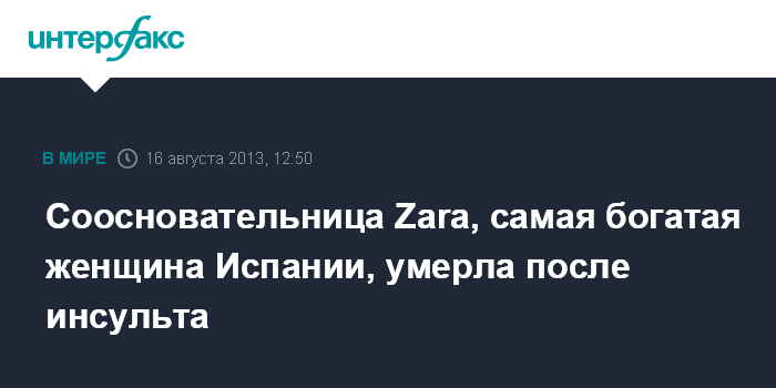 Вашингтон. 16 август. INTERFAX.RU - Одна из создателей всемирно известного бренда одежды Zara и самая богатая женщина Испании Розалия Мера скончалась в возрасте 69 лет после инсульта, сообщает в пятницу американский журнал Forbes.