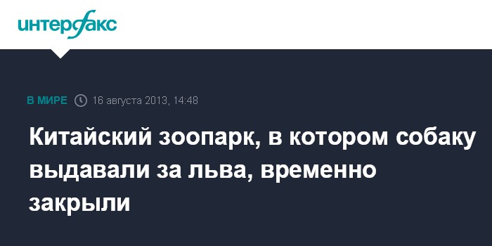 Пекин. 16 августа. INTERFAX.RU - Руководство зоопарка города Лохэ в китайской провинции Хэнань, где выдавали обычную собаку за африканского льва, приняло решение временно закрыть его, передают в пятницу местные СМИ.