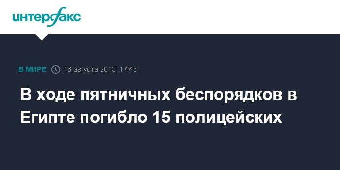 Дубай. 16 августа. INTERFAX.RU - 15 сотрудников полиции погибли в пятницу во время беспорядков в Египте, сообщает межарабский телеканал "Аль-Арабийя".
